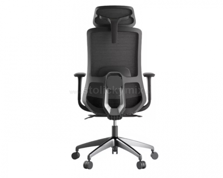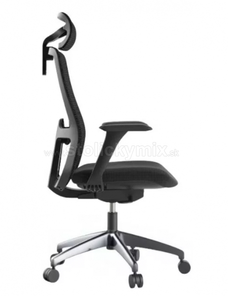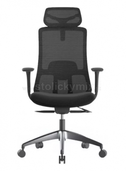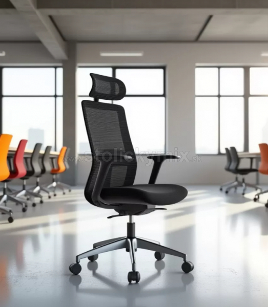 VYHOTOVEVIE STOLIČKY: čalúnenie sedáku stoličky je v čiernej farbe, sieťovina na operadle a opierke hlavy je v čiernej farbe.