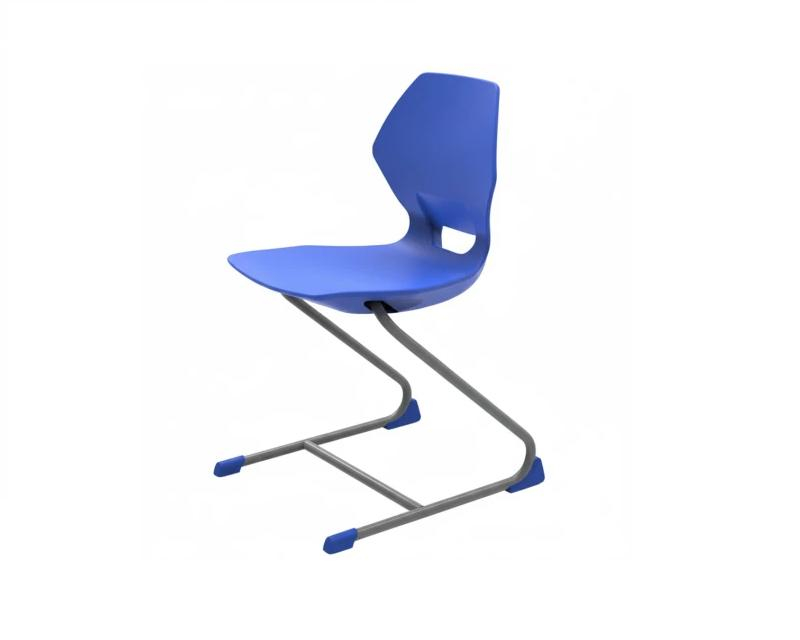 Moderná školská stolička kovovej konštrukcie na lyžine s pevným plastovým sedadlom.