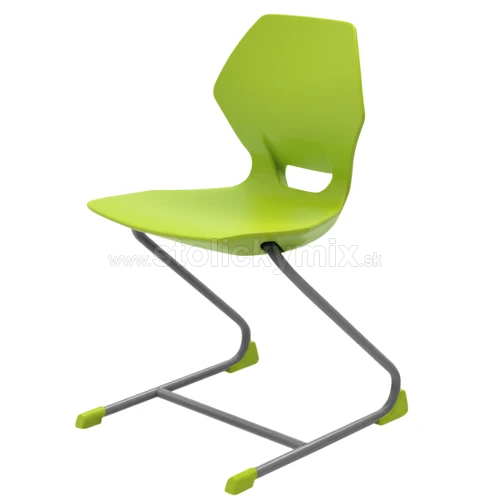 Moderná školská stolička kovovej konštrukcie na lyžine s pevným plastovým sedadlom.