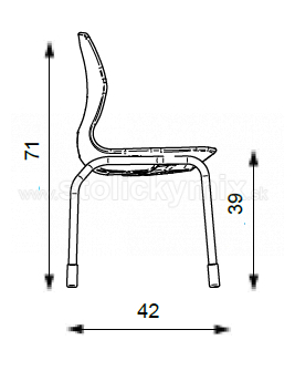 Moderná školská stolička na 4 nohách kovovej konštrukcie s pevným plastovým sedadlom.