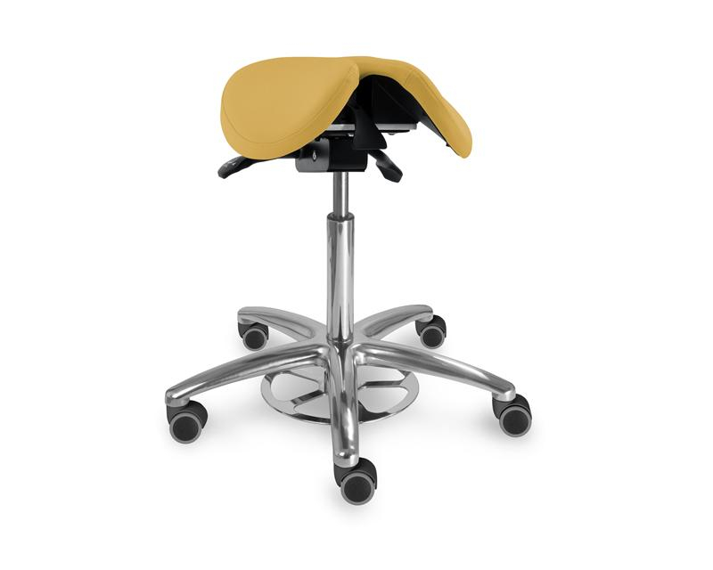Zdravotnícka otočná vyšetrovacia stolička s veľkým tvarovaným nastaviteľným deleným sedákom typu "sedlo". Ergonomické stabilné sedenie s možnosťou náklonu sedáku dopredu 0-11 stupňov alebo dozadu 0-7 stupňov. Mimoriadne vhodný model na pracoviská kde je z hľadiska hygieny potrebné nastaviť výšku sedu nohou, ľahká údržba stoličky.