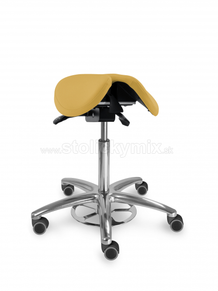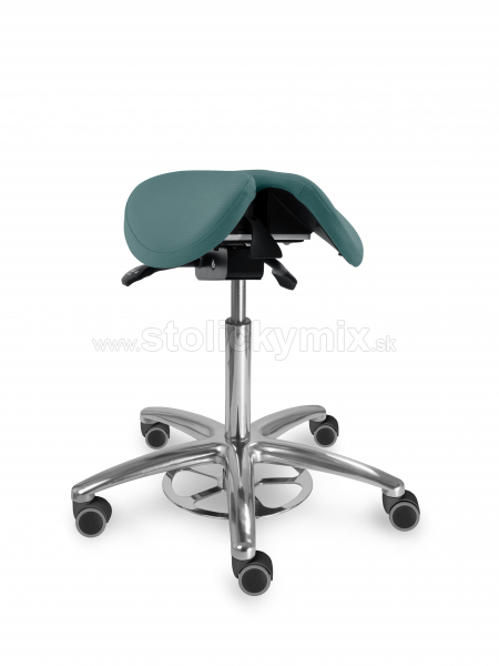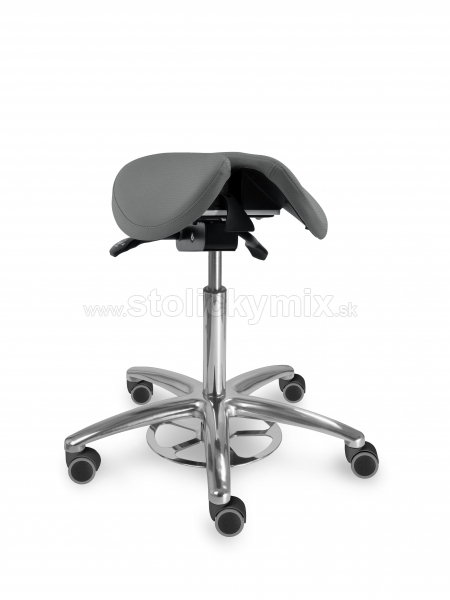 Zdravotnícka otočná vyšetrovacia stolička s veľkým tvarovaným nastaviteľným deleným sedákom typu "sedlo". Ergonomické stabilné sedenie s možnosťou náklonu sedáku dopredu 0-11 stupňov alebo dozadu 0-7 stupňov. Mimoriadne vhodný model na pracoviská kde je z hľadiska hygieny potrebné nastaviť výšku sedu nohou, ľahká údržba stoličky.